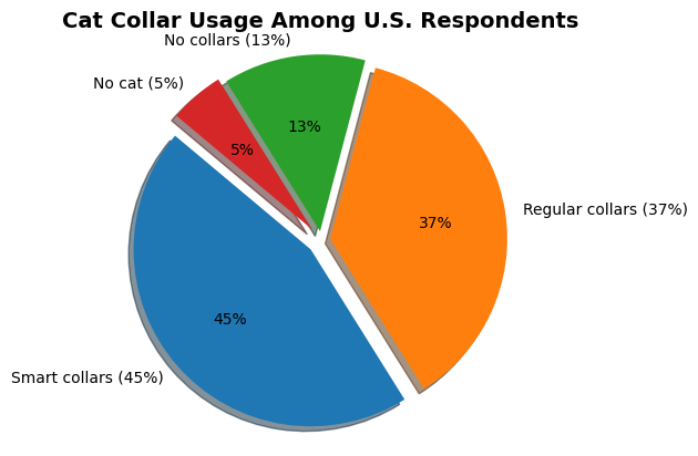 The pie chart highlights clear trends in cat collar usage among U.S. respondents. Nearly half of cat owners (45%) already prefer smart collars, emphasizing the growing demand for advanced tracking and safety solutions. Traditional collars remain relevant at 37%, while a smaller group of owners either do not use collars (13%) or do not own a cat (5%).